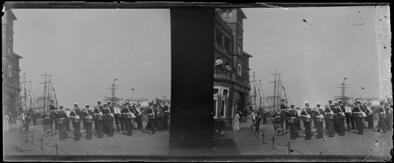 [Un orchestre militaire joue sur le quai d'un port anglais].