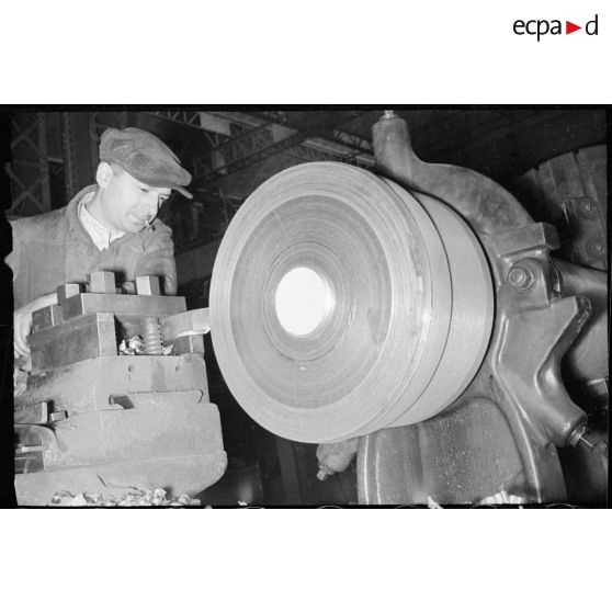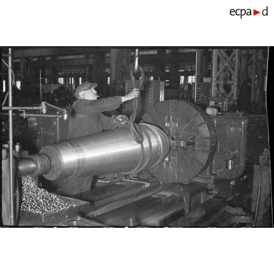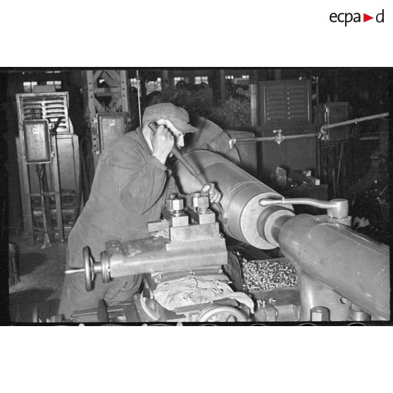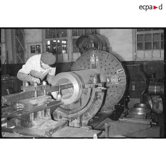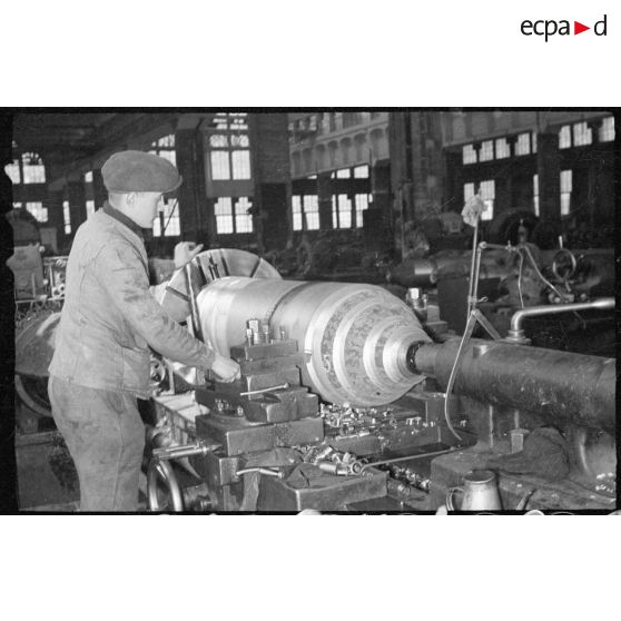 Un ouvrier tourne un tube de canon sur une machine-outil.
