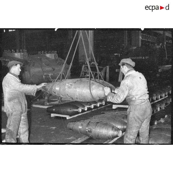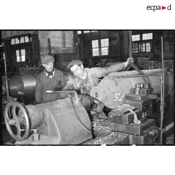 Deux ouvriers tournent un corps de bombe sur une machine-outil.