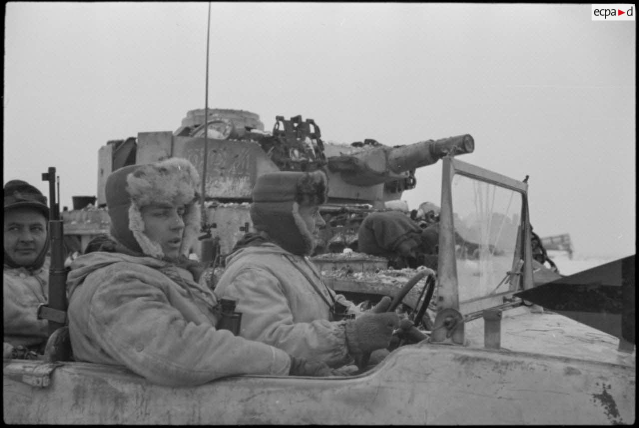 Un officier inspecte le front à bord d'une chenillette NSU "Kettenkrad" immatriculée WH-468 849.