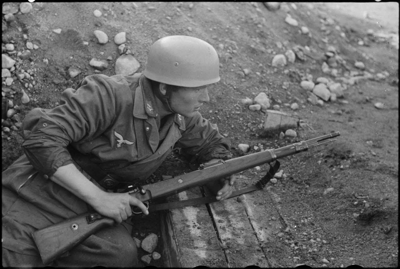 Un fantassin allemand de la Luftwaffe équipé d'un fusil Mauser 98 k lors de manoeuvres du 8./LLG 1 (Lulftlandegeschwader 1) sur le terrain d'aviation de Banak en Norvège.