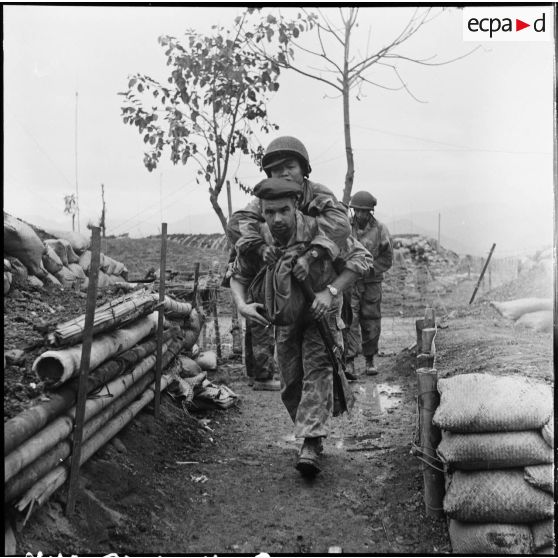Un parachutiste blessé est soutenu par deux de ses camarades qui l'évacuent vers l'antenne chirurgicale du camp retranché de Diên Biên Phu.