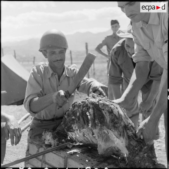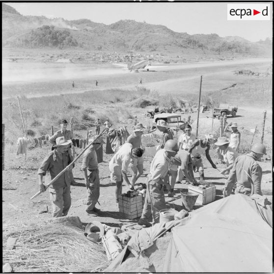 Bataille de Na San. Le 1er décembre au matin, une contre-attaque du 3e BPC (bataillon de parachutistes coloniaux) permet de récupérer le PA 24 (point d'appui) du camp retranché de Na San, enlevé par le Viêt-Minh dans la nuit du 30 novembre au 1er décembre 1952. Les parachutistes du 3e BPC mènent un assaut puissant vers la PA 24, avec l'appui de l'aviation et de l'artillerie; on soigne, on opère et on transfuse les blessés; des tirailleurs découpent de la viande pour le repas; les parachutistes recensent les blessés et les prisonniers Viêt-minh après le combat.