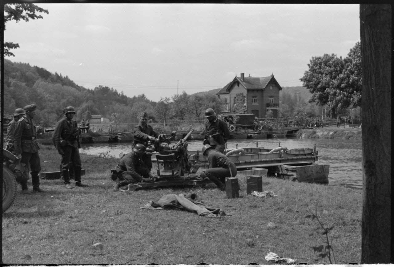 Construction d'un ponton par le 48e bataillon du Génie (Pioneer.Bataillon.48) sur la rivière Ourthe, ponts flottants Brückengerât B pour faire traverser la 8e division d'infanterie. Pour la protection du pont, une pièce de DCA de 2 cm Flak 30 du Flak-Lehr-Regiment.