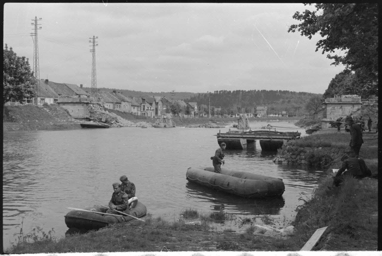 Construction d'un ponton par le 48e bataillon du Génie (Pioneer.Bataillon.48) sur la rivière Ourthe, ponts flottants Brückengerât B pour faire traverser la 8e division d'infanterie. Pour la protection du pont, une pièce de DCA de 2 cm Flak 30 du Flak-Lehr-Regiment.