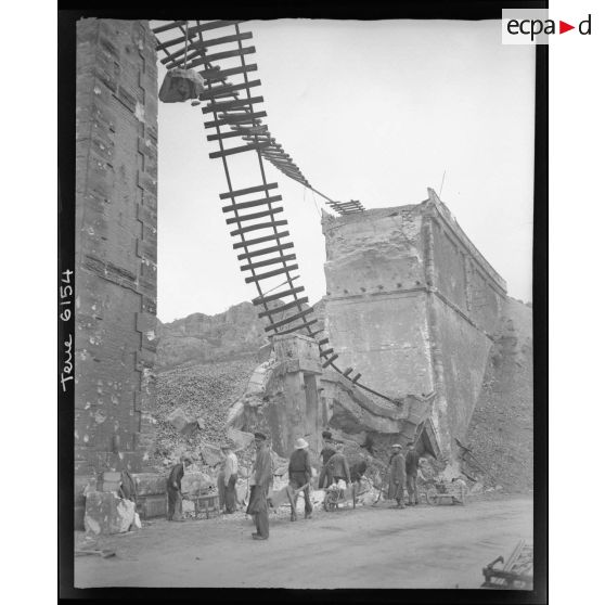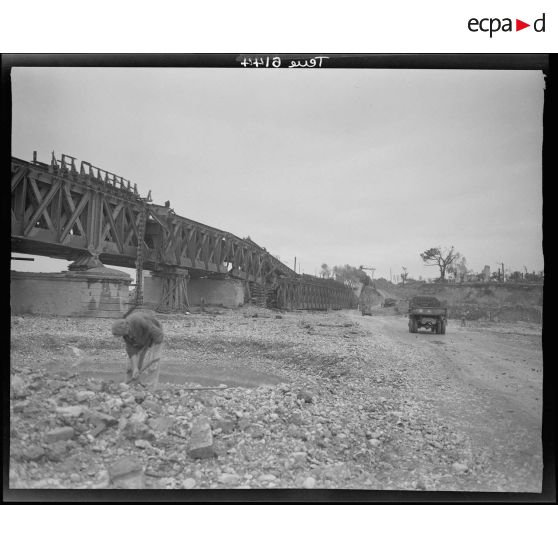 Les deux piliers Est du viaduc d'Anthéor et la voie ferrée détruits par des bombardements aériens.