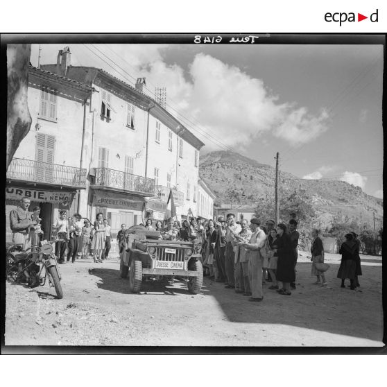 Dans Monaco libérée, les reporters de guerre du SCA (Service Cinématographique des Armées) arrivent en jeep et la population accueille avec allégresse les Alliés, déployant à leur passage des banderoles de bienvenue.