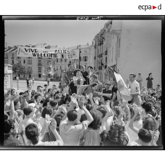 La foule acclame les opérateurs du service cinématographique de l'Armée (SCA) qui d'après la légende d'origine accompagnent la première patrouille américaine.