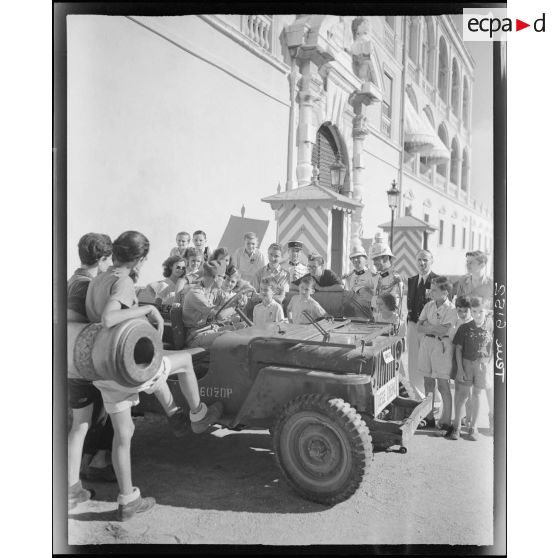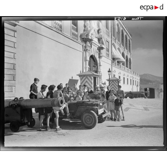 Une jeep Willys du service cinématographique de l'Armée (SCA) stationne devant le palais princier de Monaco.