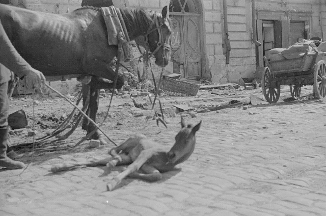 Un poulain est allongé au milieu de la route, entouré par les décombres de la ville, qui pourrait être Petrozavodsk (Carélie, Russie).