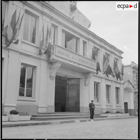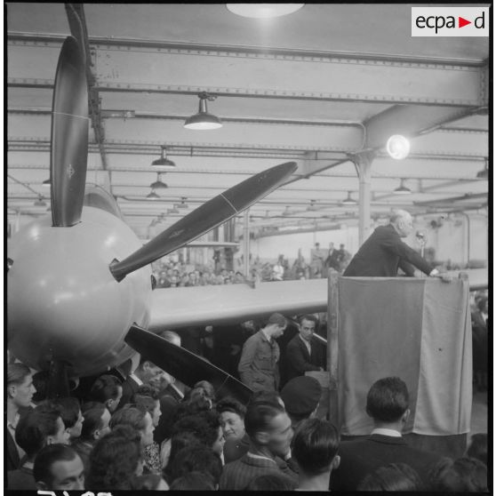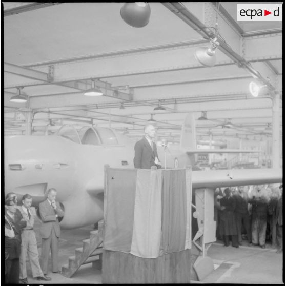 Puis il se rend à Villeurbanne, à l'Arsenal de l'aéronautique, un établissement d'Etat créé en 1934 pour dynamiser l'aéronautique militaire de pointe et combler le retard avec les voisins de la France. Originairement situé à Villacoublay, l'Arsenal de l'Aéronautique fut replié sous l'occupation à VIlleurbanne, dans les ateliers du motoriste EETIM. Après avoir visité les installations de l'établissement, il y prononce un discours devant le prototype d'un Arsenal VB10.Ce chasseur-bombardier fut conçu pendant l'Occupation par Michel Vermisse, ingénieur général de l'Air responsable des recherches à l'Arsenal de l'aéronautique, et réalisé à la Libération.