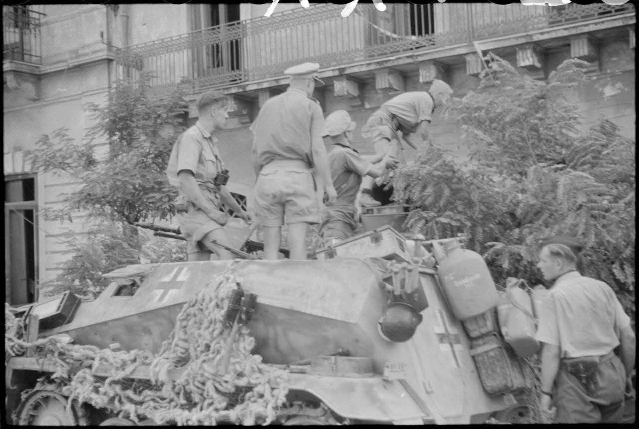 Dans le secteur de Catane en Sicile, la rencontre entre des fantassins du Panzer-Grenadier-Regiment Hermann Goering et des Italiens d'une unité d'infanterie.