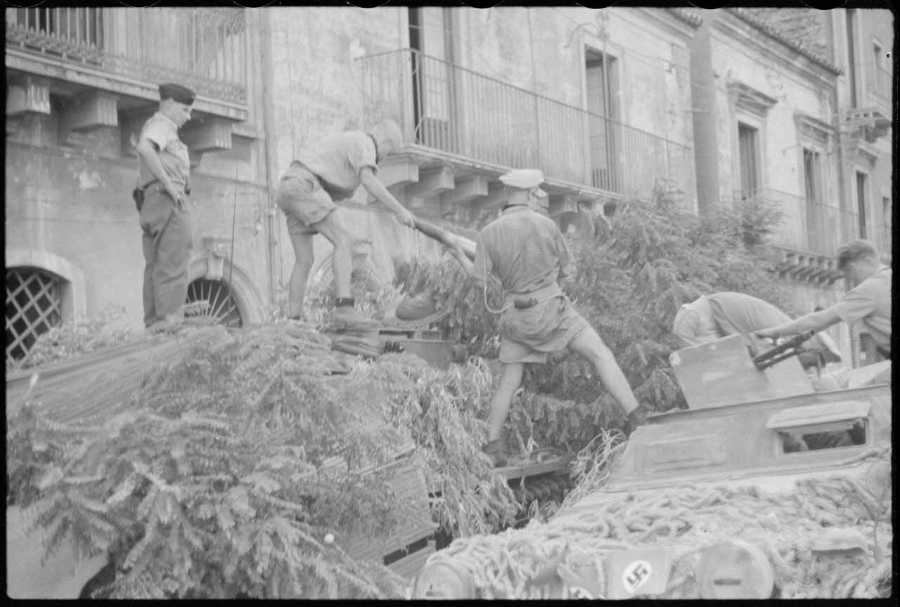 Dans le secteur de Catane en Sicile, la rencontre entre des fantassins du Panzer-Grenadier-Regiment Hermann Goering et des Italiens d'une unité d'infanterie.