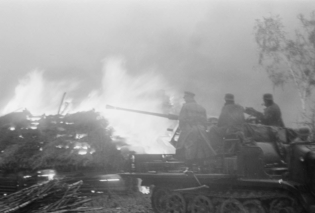 Un semi-chenillé Sd.kfz.7/1 armés de 2 cm FlaKvierling 38 dans un village en feu.