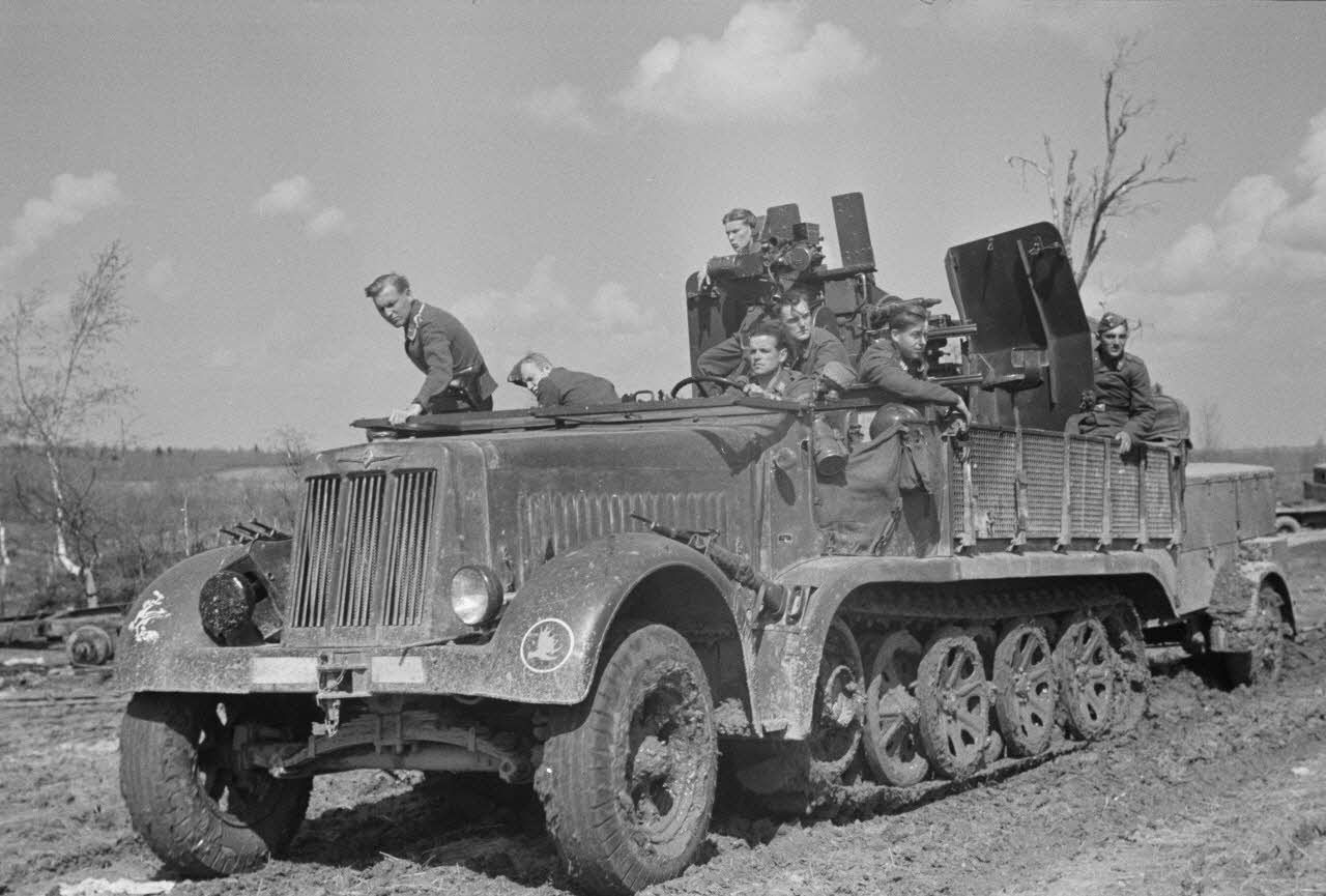 Un semi-chenillé Sd.kfz.7/1 armé de 2 cm FlaKvierling 38 et son équipage du Leichte Flak Abteilung 71 (11.Panzer-Division).