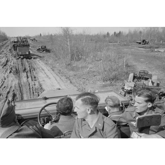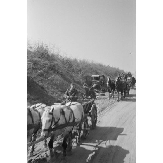 Un convoi hippomobile allemand croise les carcasses de véhicules de l'Armée rouge détruits.