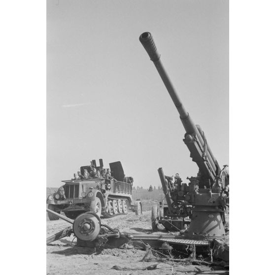 Un artilleur sur un semi-chenillé Sd.Kfz.6/2 du Leichte Flak Abteilung 71 (11.Panzer-Division) doté d'un canon de 3.7cm Flak 36 dont on aperçoit le canon.