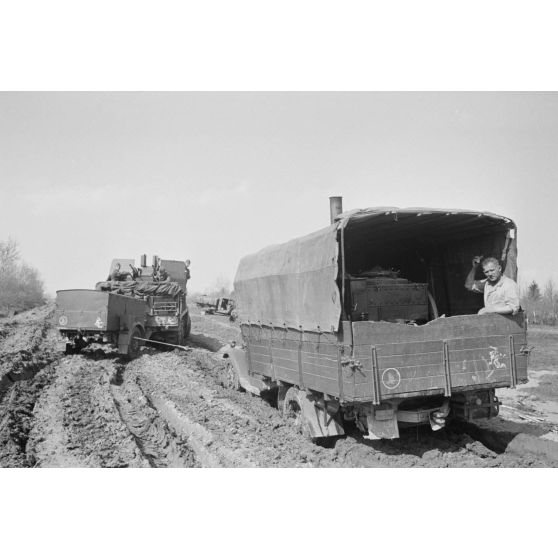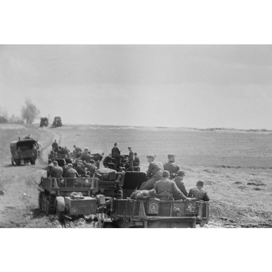 Une colonne de semi-chenillés Sd.kfz.10/5 FlaK 38 du Leichte Flak Abteilung 71 (11.Panzer-Division).