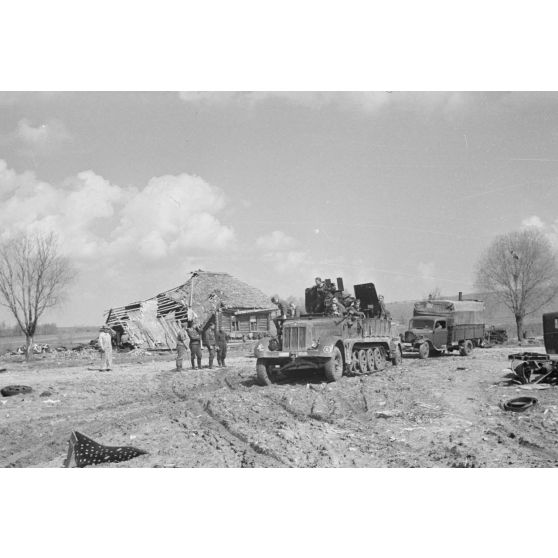 Une colonne de semi-chenillés Sd.kfz.10/5 FlaK 38 du Leichte Flak Abteilung 71 (11.Panzer-Division) marque un arrêt dans un village marqué par les combats.