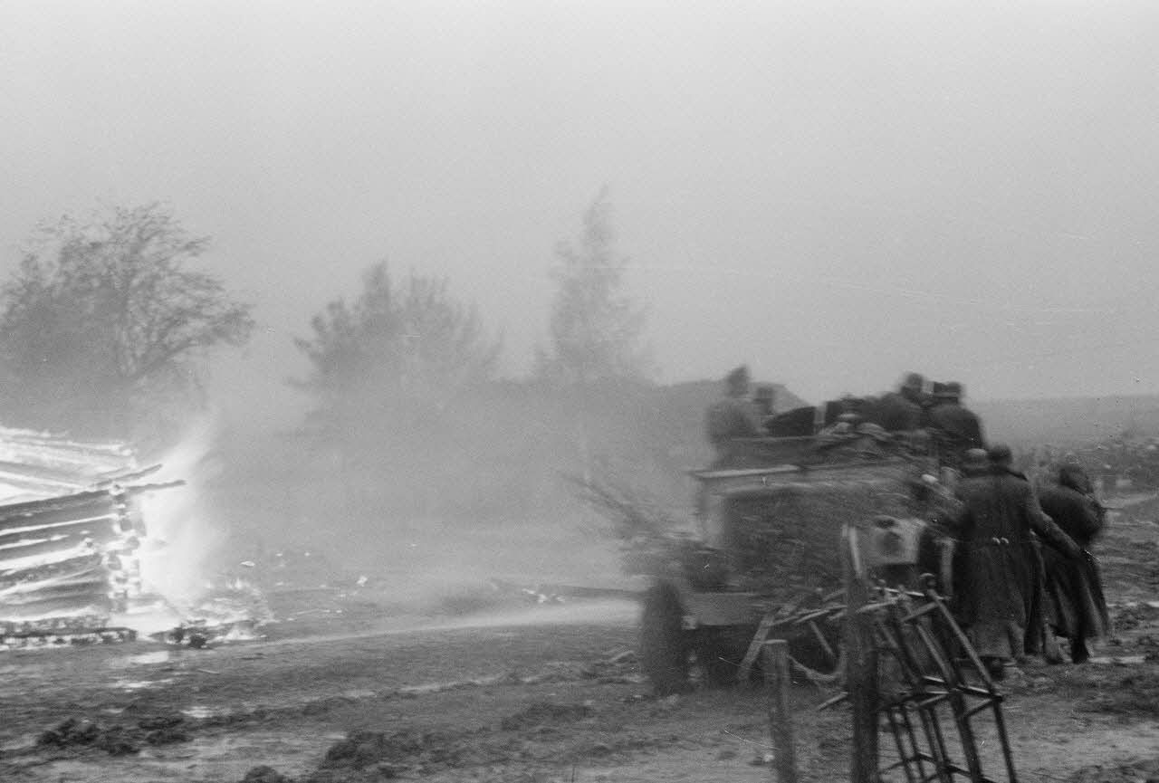 Image floue présentant des fantassins allemands dans un village récemment investi par le Leichte Flak Abteilung 71 (11.Panzer-Division).