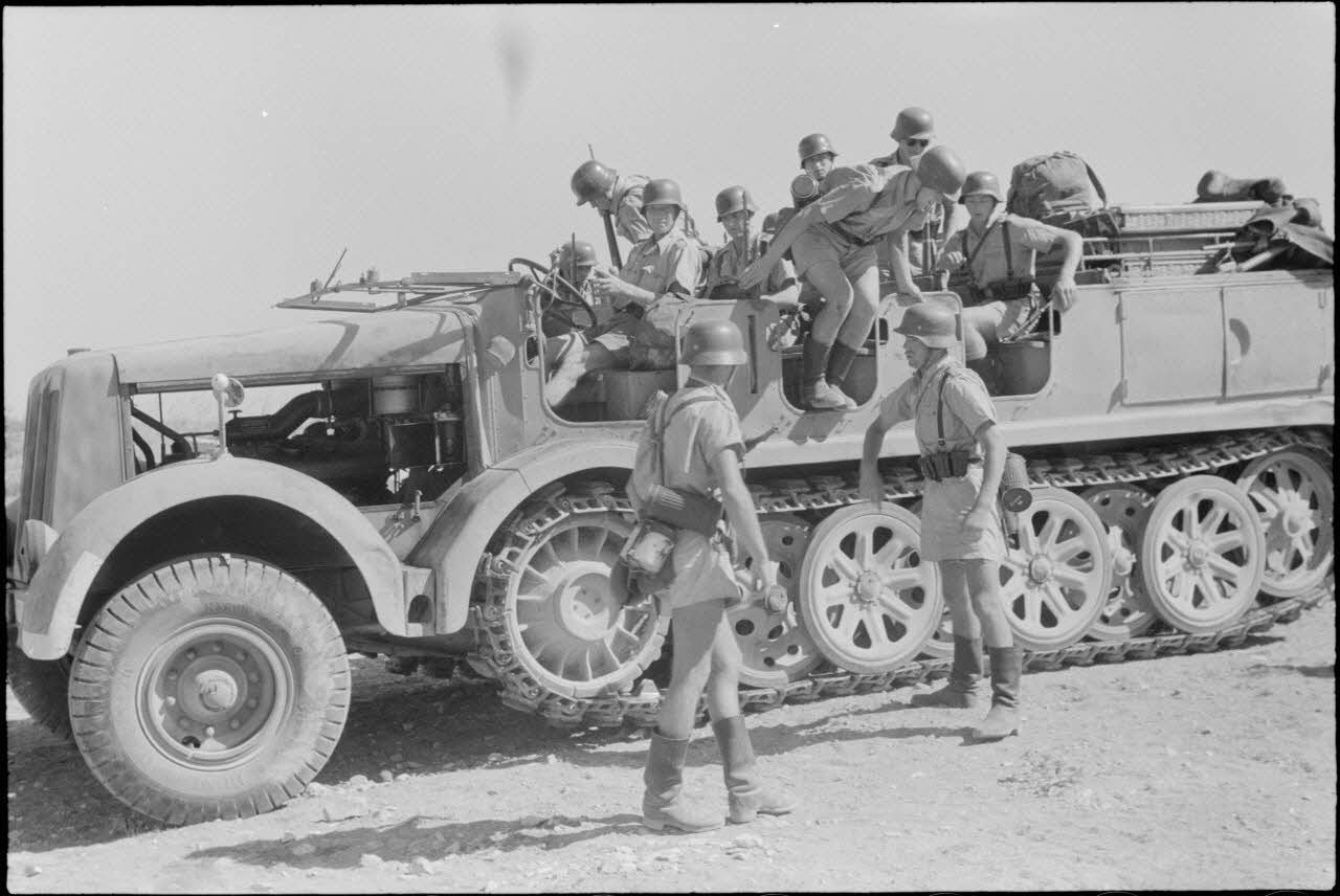 Regroupés autour d'une pièce de 8,8 cm Flak, des artilleurs italiens reçoivent une formation sur cette pièce de DCA allemande devenue un canon antichar redouté par les alliés. Le cours porte sur l'utilisation du canon comme pièce antiaérienne. On remarque la présence de cadres de la Luftwaffe. Les artilleurs sont également formés sur le télémètre (Entfernungmesser 4mRH ou Kommandogerät) qui guide la batterie de FlaK. L'accent est également mis sur la mobilité du canon. Un semi-chenillé lourd (Sd.kfz.7) tracte la pièce. Une pièce de 2 cm Flak est tractée par un véhicule Krupp Protze Kfz.70.