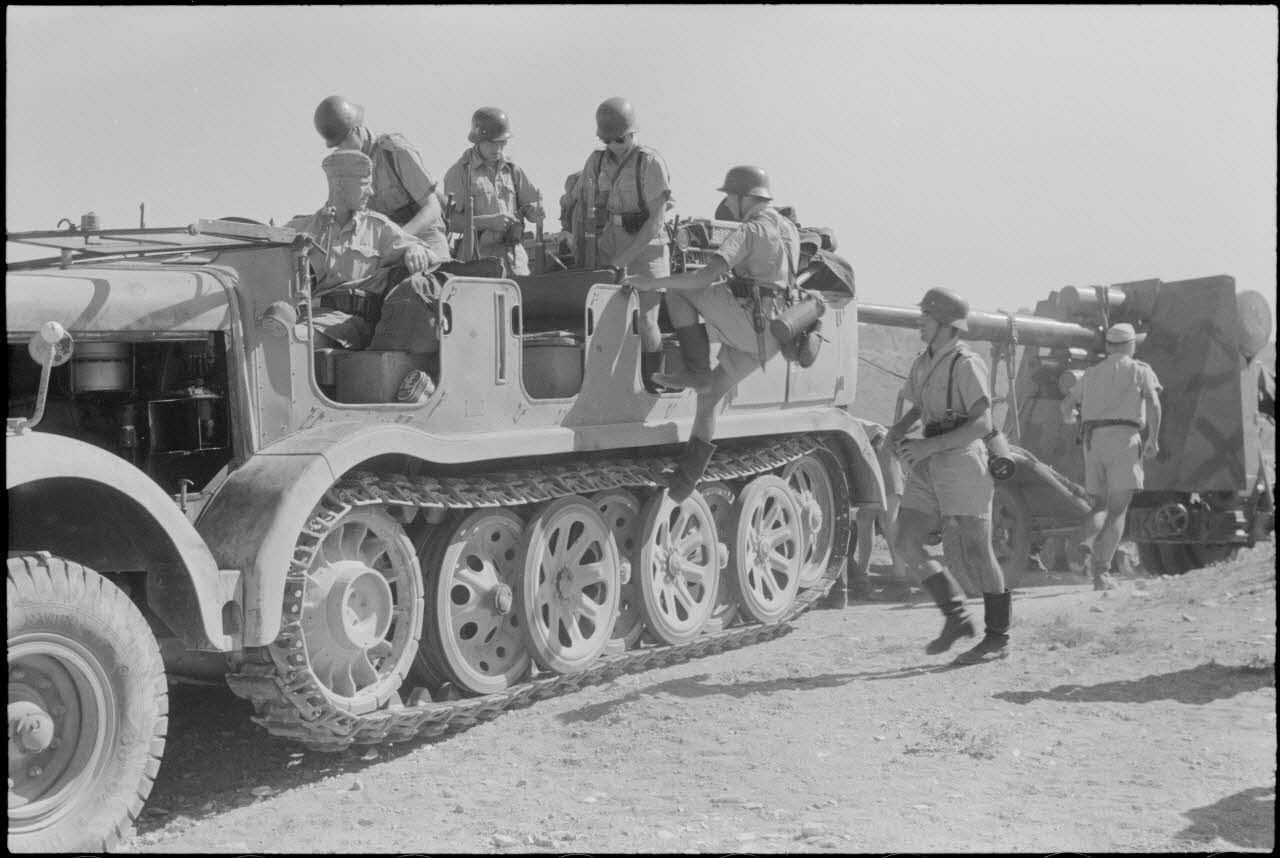 Un semi-chenillé Sd.kfz.7 s'apprête à tracter une pièce de 8,8 cm FlaK que les artilleurs viennent d'atteler.