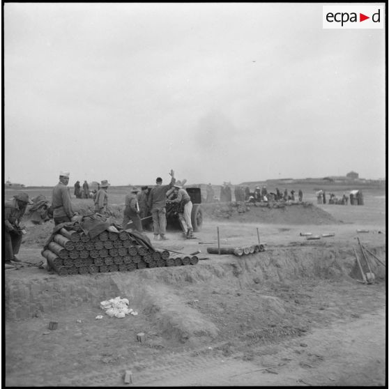 Artillerie en action au bas du poste de Vinh Yen avec les hommes de la 1re batterie du 4e régiment d'artillerie coloniale du Maroc (4e RACM).