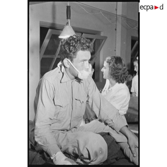 Un soldat, blessé dans la bataille de Diên Biên Phu, est osculté dans la salle de triage de l'hôpital militaire Lanessan.