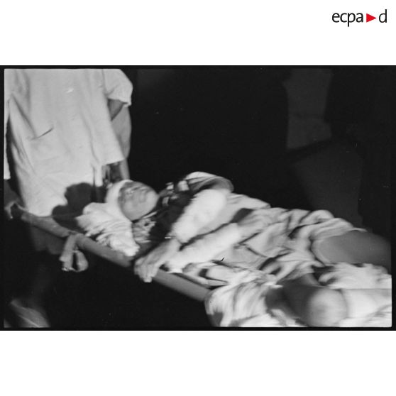 Un soldat, blessé dans la bataille de Diên Biên Phu, transporté dans l'hôpital militaire Lanessan.