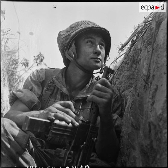 Un soldat muni d'un pistolet-mitrailleur MAT 49 dans une tranchée Viêt-minh lors d'une contre-attaque au sud de Diên Biên Phu.