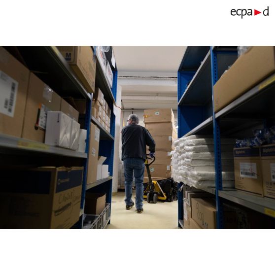 Un préparateur de commandes travaille au sein du stock de médicaments de l'HIA de Percy.