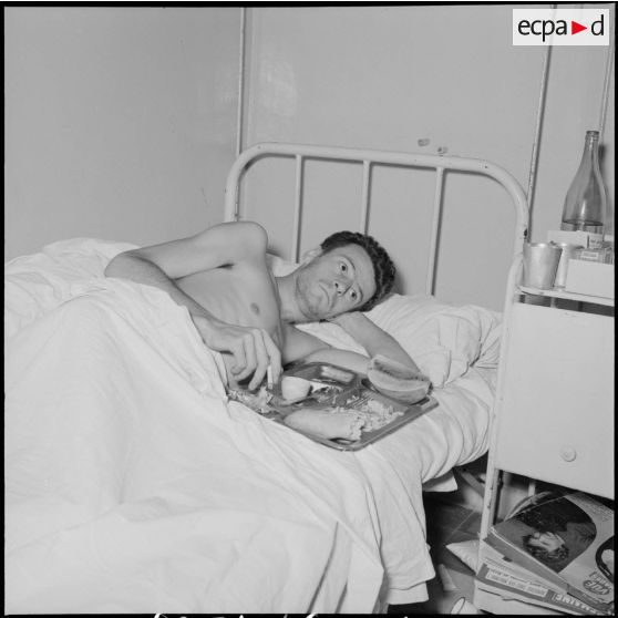Un soldat de 2e classe du 1er bataillon du 2e régiment étranger d'infanterie (1/2 REI) blessé à Diên Biên Phu et rapatrié à l'hôpital Grall de Saigon prend un repas dans son lit.