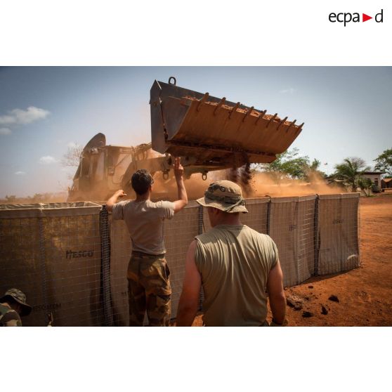 Des soldats du détachement du 3e RG du GTIA (groupement tactique interarmes) Turco remplissent de terre des Hesco bastions destinés à ériger un mur de fortification à l'aide d'une tractopelle EGRAP (engin du génie rapide de protection), lors de travaux de réaménagement de la POD (plateforme opérationnelle défense) de Bambari.