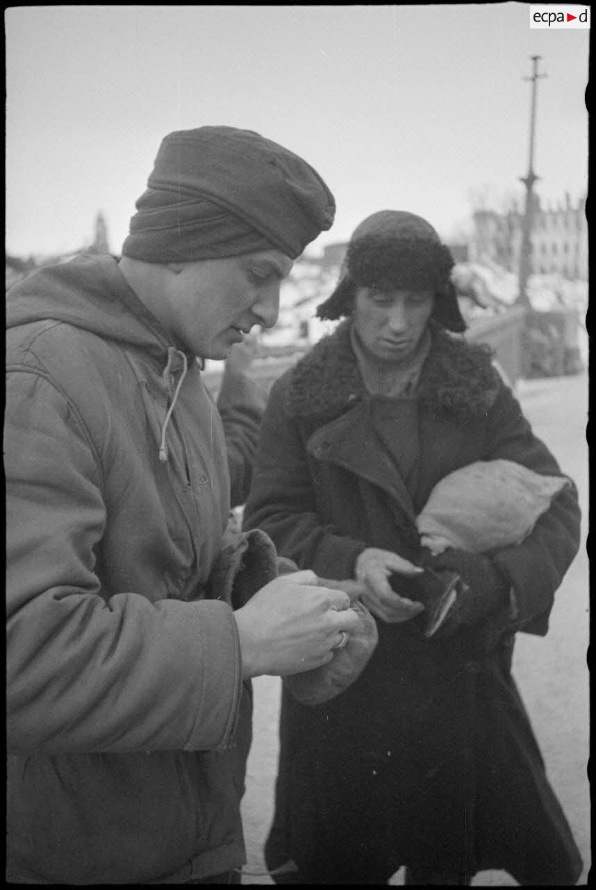 Sur le front sud, des soldats sont envoyés dans la zone arrière pour récupérer (repos). Sur la ligne de bataille principale, on prend congés de permissionnaires et ils sont transportés par camions. Un général aux contacts de persmissionnaires, des colis sont distribués devant la devanture du cinéma.