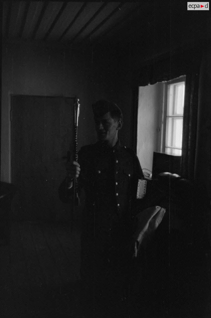 Un soldat vient d'emprunter le bâton de maréchal de Ernst Busch et joue avec, dans l'autre bras, une boite de cigares.