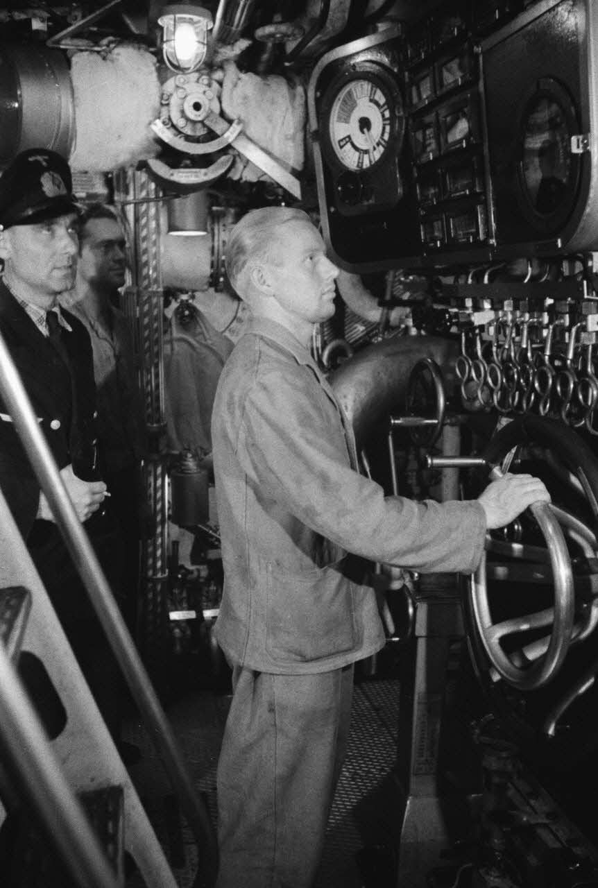 Un Sonderführer et un mécanicien dans la salle des machines d'un dragueur de mines (Minensuchboot) de la Kriegsmarine.