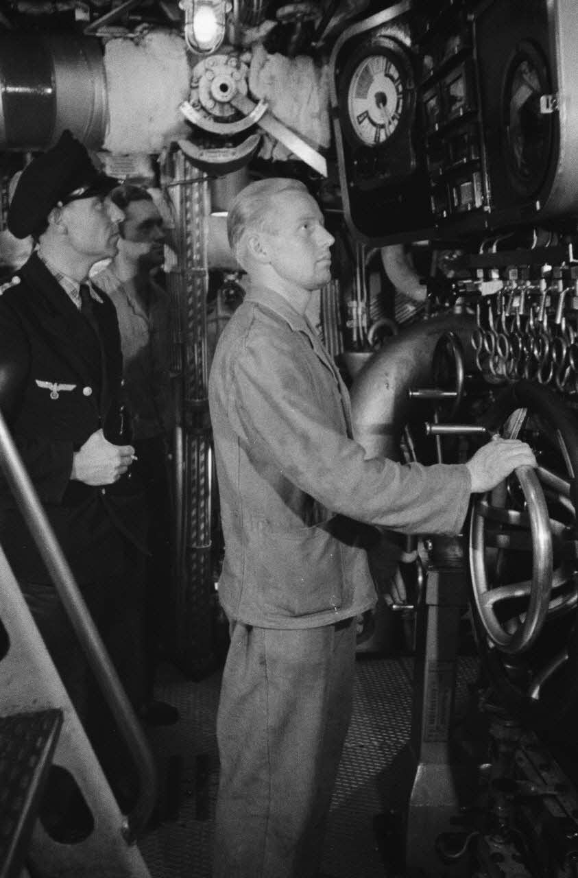 Un Sonderführer et un mécanicien dans la salle des machines d'un dragueur de mines (Minensuchboot) de la Kriegsmarine.