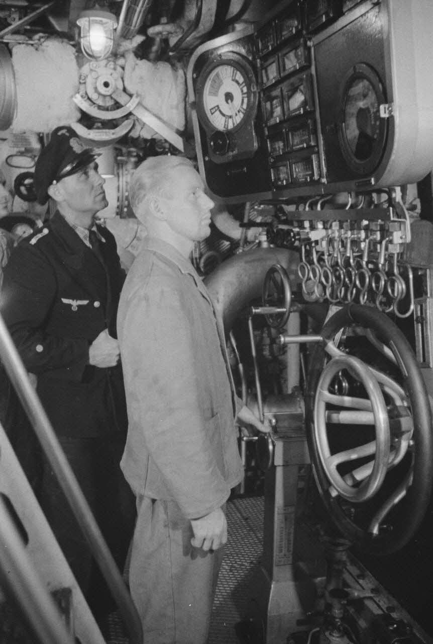 Un Sonderführer et un mécanicien dans la salle des machines d'un dragueur de mines (Minensuchboot) de la Kriegsmarine.