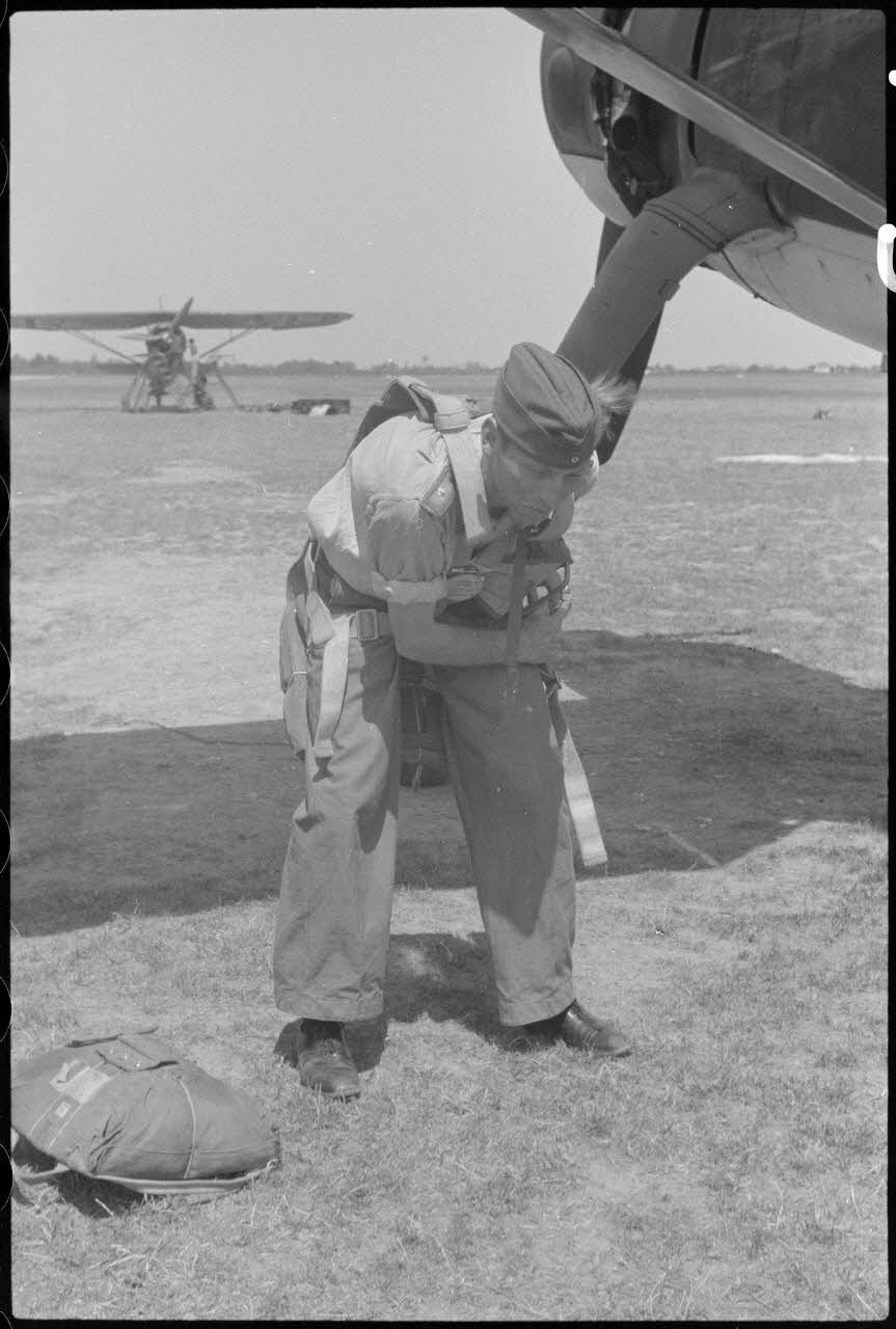 Un sous-officier de la 1re escadre aéroportée (Luftlandegeschwader 1) s'équipe de son parachute avant de monter dans un Henschel Hs-126.
