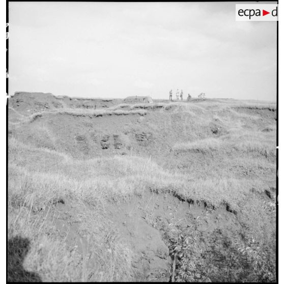 Plan général d'un paysage herbeux avec en fond de tableau un poste de combat camouflé et des soldats autour.
