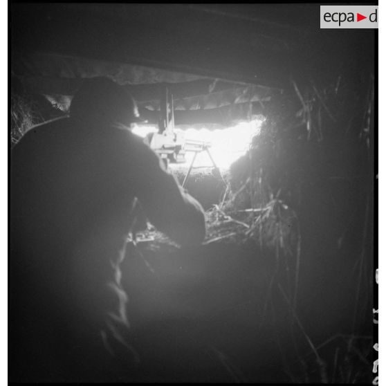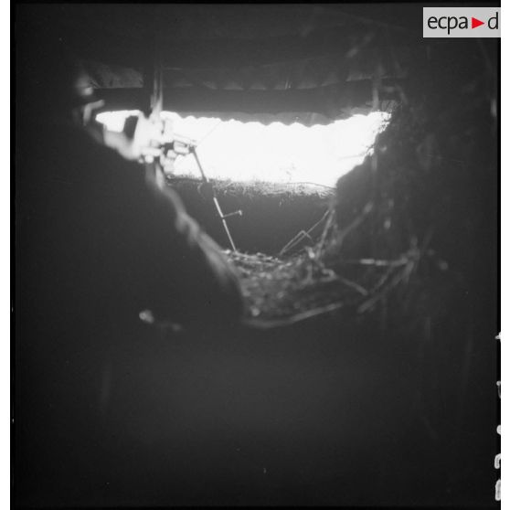 Vue intérieure à contre-jour d'un poste de combat, un tireur et son FM M24/29 sont à peine visibles.