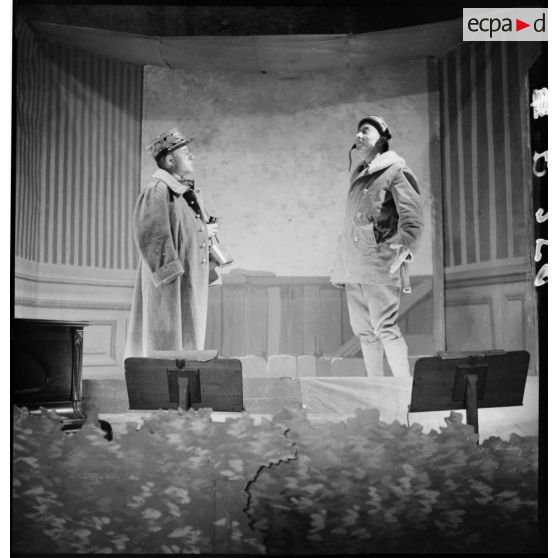 Sur une scène, photographie de groupe de comédiens d'un théâtre aux armées.