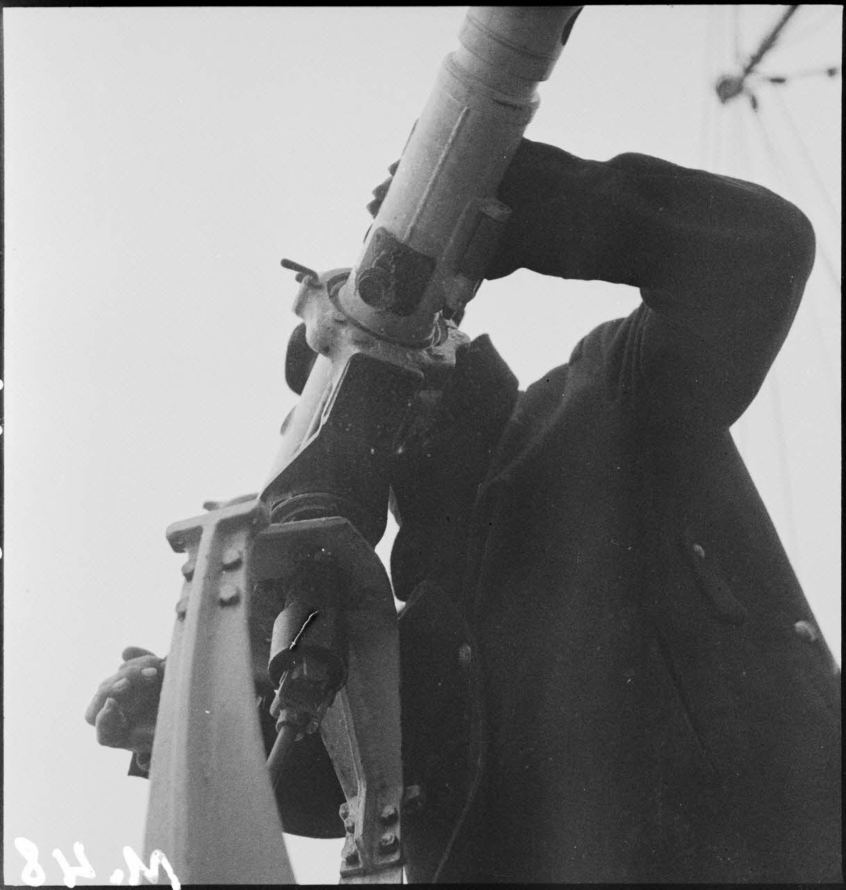 Portrait en contre-plongée d'un marin canonnier de guet à bord du contre-torpilleur Le Malin.