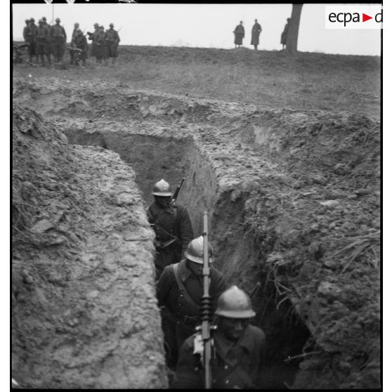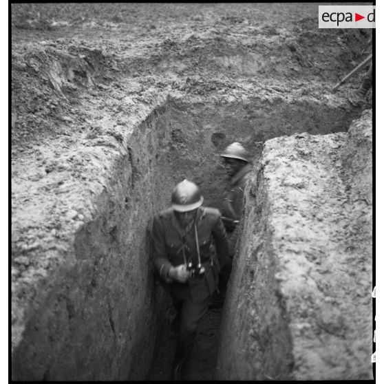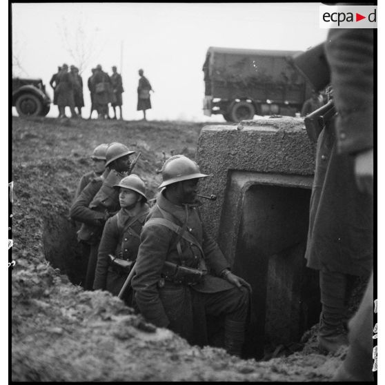 Des tirailleurs sénégalais de la 5e armée sont photographiés dans une tranchée près d'un abri bétonné.