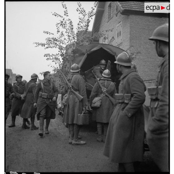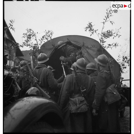 Des tirailleurs sénégalais de la 5e armée embarquent à bord de camions.