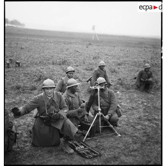 Des tirailleurs sénégalais de la 5e armée servent des mortiers de 81 mm modèle 1917/1931.