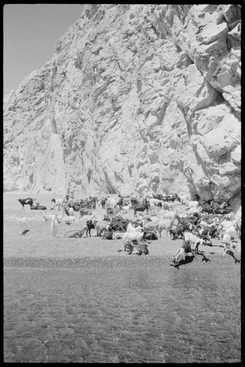 Un troupeau sur la plage de Perissa, île de Santorin.