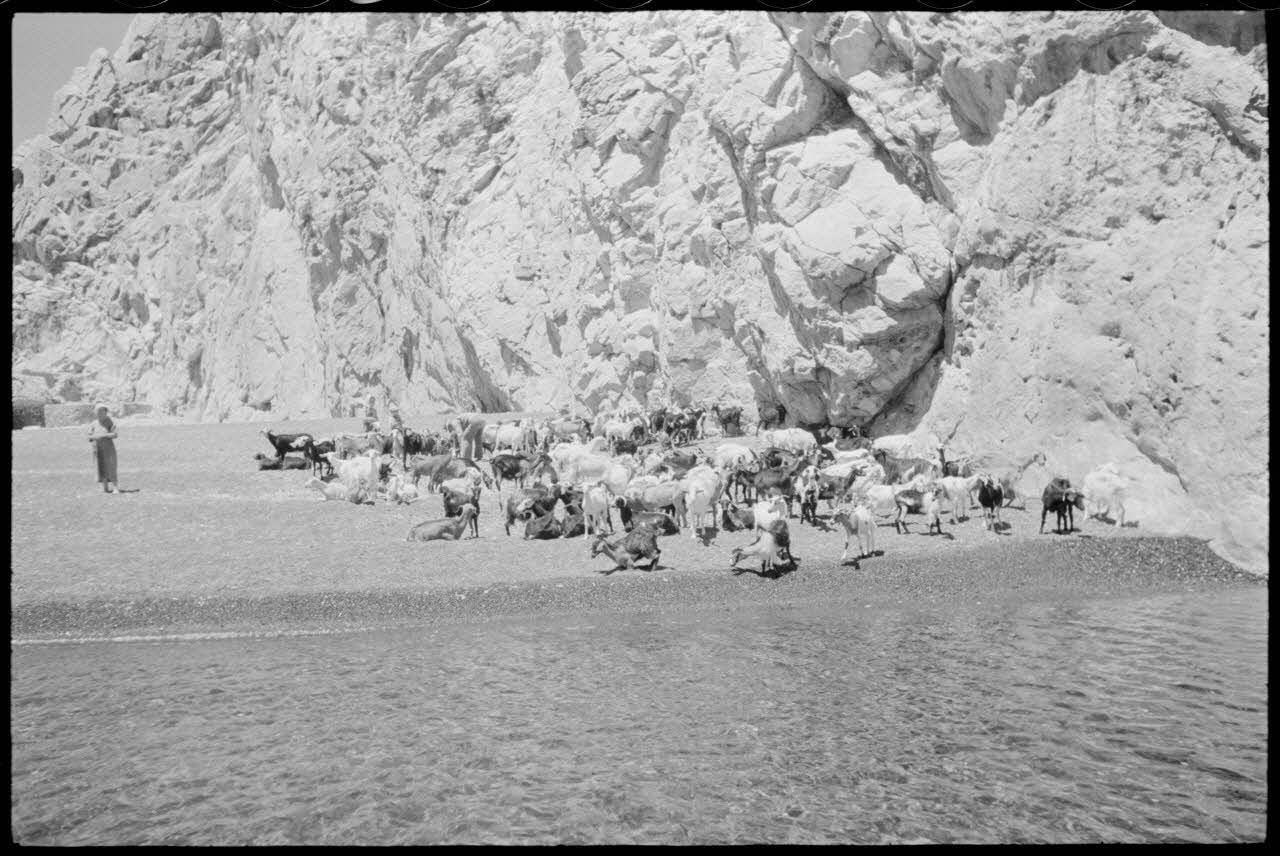 Un troupeau sur la plage de Perissa, île de Santorin.