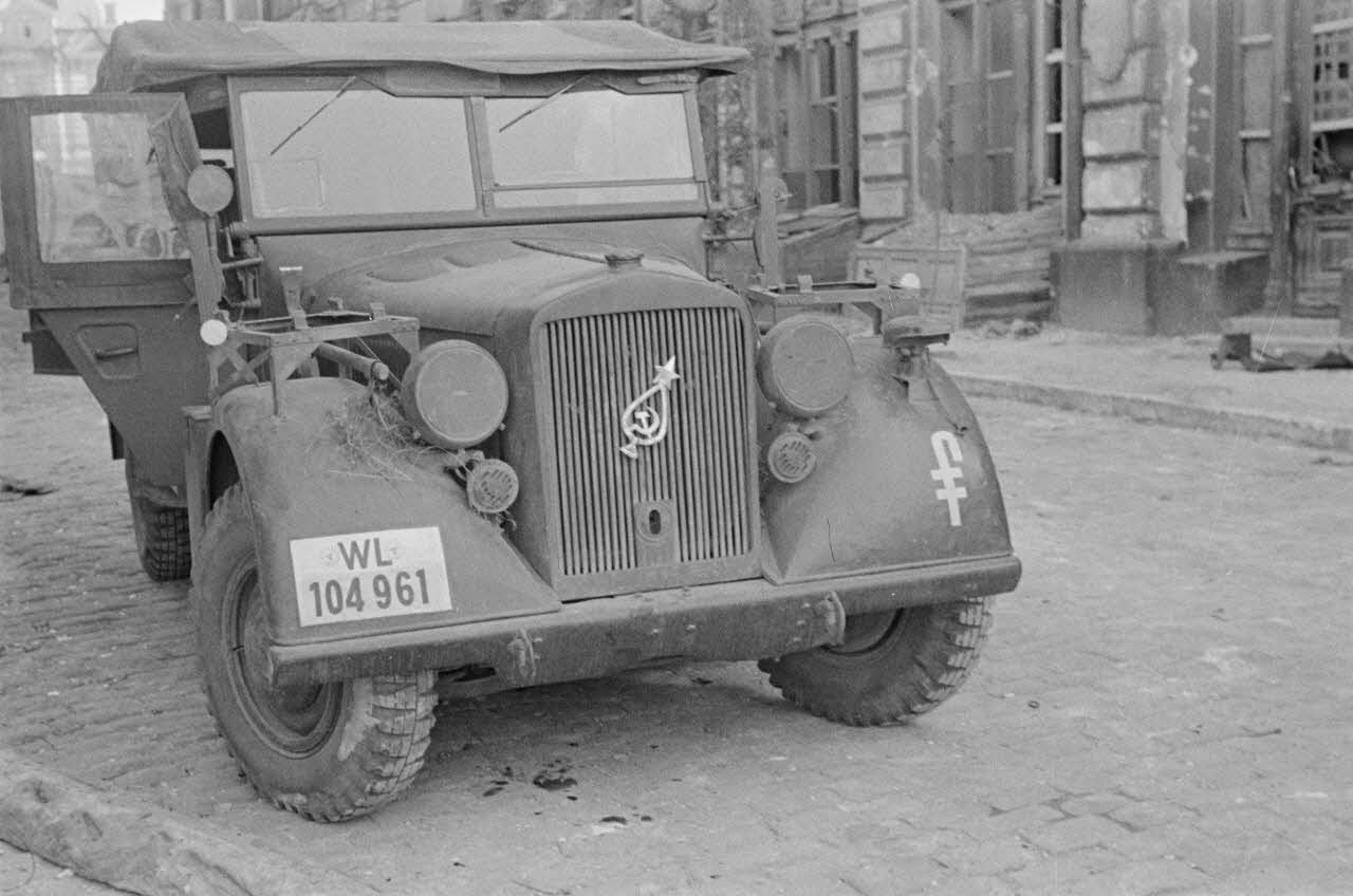 Un véhicule, un Kfz.15, de la compagnie de propagande Luftwaffe Z.b.v stationne dans une rue, qui est probablement la ville de Petrozavodsk (Carélie, Russie).