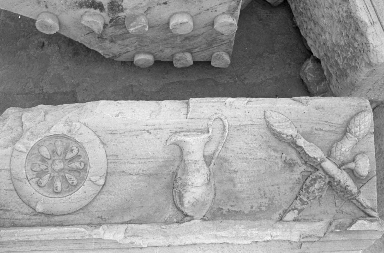 Une architrave avec des bouquets d'épis de blé, une bulle (kistis) et les deux flambeaux croisés, symboles de fertilité et des Mystères d'Eleusis.